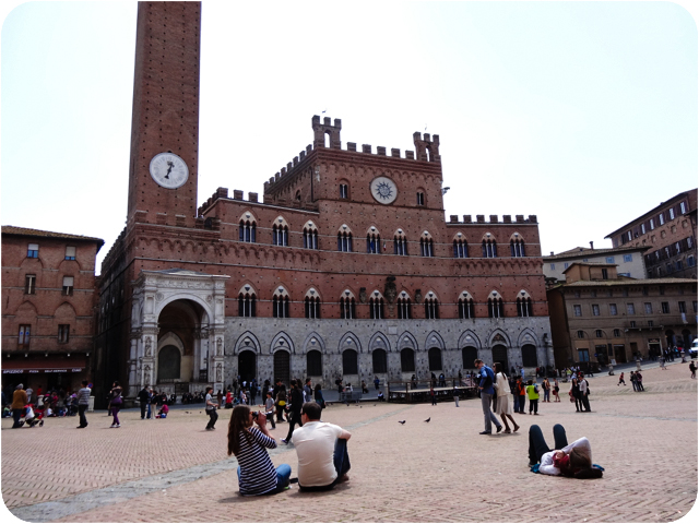 The Campo is one of my favorite squares. The Palio di Siena (horse-race) is held here twice a year. On a nice day one will see people sitting or laying down on the square’s sloping floors, having a picnic, or just hanging out with friends.