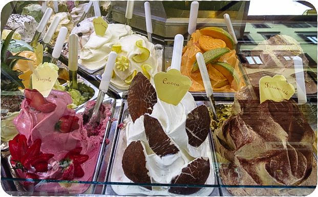 What’s the difference between a gelato and an ice cream, you may wonder?  Well, gelato is churned at a slower speed which makes it denser. It also contains less fat.  It tastes creamier somehow.  Though I’m not fond of ice cream, I couldn’t possibly leave Italy without partaking of this typical Italian refreshment. What better place to have it than where it was first created.