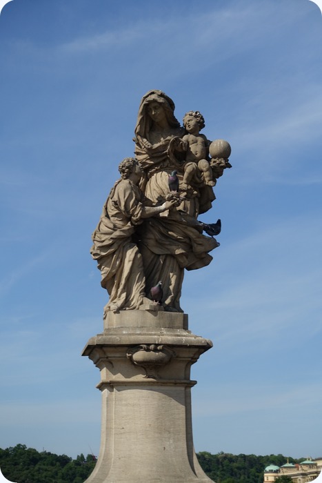 Charles Bridge, a historic bridge that crosses the Vltava river. It connects the Castle District with the Old Town. It is usually lined with art vendors and performers.Charles Bridgethe Madonna and Child, one of the sculptures lining the Charles BridgeCharles Bridge sculptures