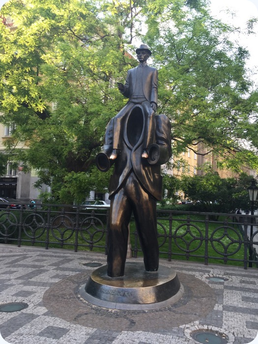 pregnant lady metal sculpture.Franz Kafka on his own headless body
