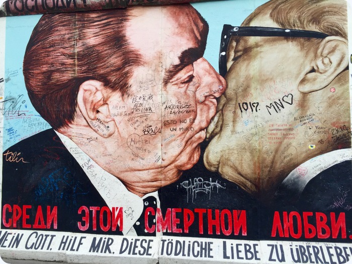East Side Gallery: at .62 miles long, it is the longest stretch of the Berlin Wall in the city. In 1990 the wall was painted by artists from all over the world. Now unfortunately these paintings have been covered by graffiti and signatures of tourists. Here are some sections I like: